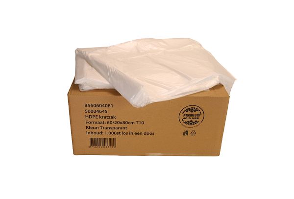 Afvalzak HDPE 60/20x80 cm T10 transparant (1000 zakken) (Kratzak)